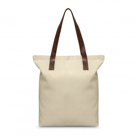 Robust tote bag with a base gusset for added capacity which is manufactured from 280gsm natural heavy cotton canvas. It has a zippered top closure and on-trend long brown PU handles which are ideal for carrying it on a shoulder.