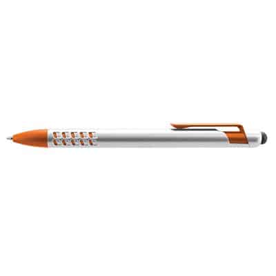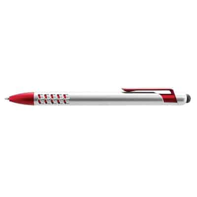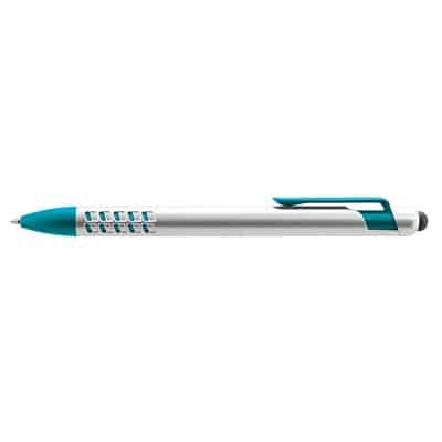 Retractable plastic ball pen with a metallic silver barrel, metallic trim and a black refill with 500 metres of writing ink. It features a unique spring loaded holder located in the retractable mechanism which will securely hold a phone and angle it upwards for easy hands free viewing.