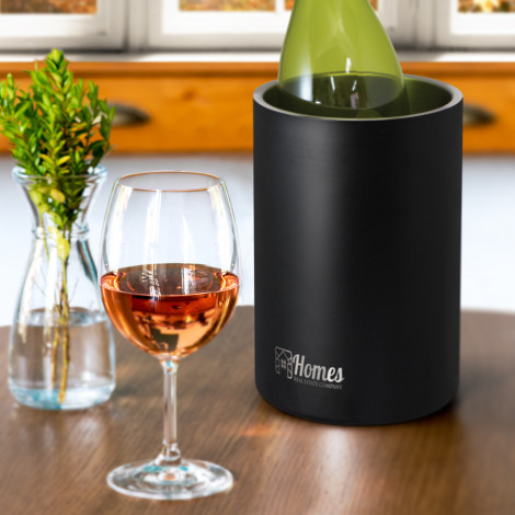Design-inspired, double wall stainless steel cooler with vacuum insulation to keep pre-chilled wine cold for longer. It has a matt black outer wall and laser engraves to a shiny steel finish. Bacchus is presented in a black gift box. It is not dishwasher safe and handwashing is recommended.
