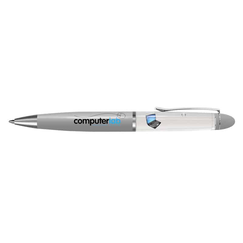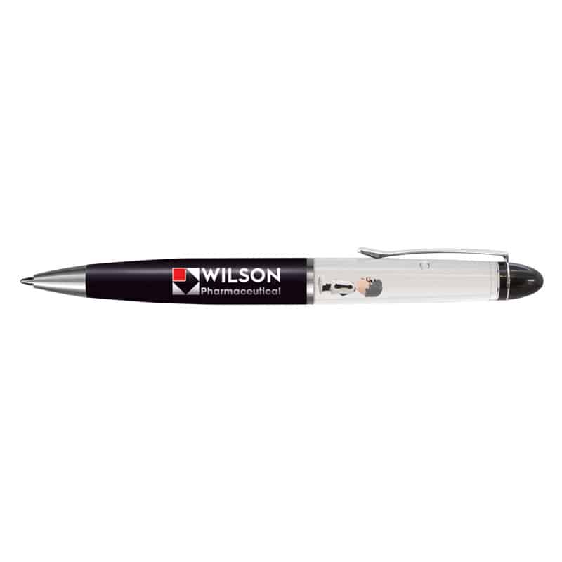 Brass barrel, liquid filled floating action ball pen with a twist mechanism and the choice of a blue or black refill. It can be configured with an insert panel which is printed in full colour on both sides along with a customised two dimensional floater that moves vertically when the pen is inverted. The other option is a three dimensional floater (without the insert panel) which requires a mould charge. The barrel can be manufactured in any PMS colour for an additional charge. A lead time of 30 working days applies to this product by air freight and orders can be sea freighted on request to reduce the freight cost.