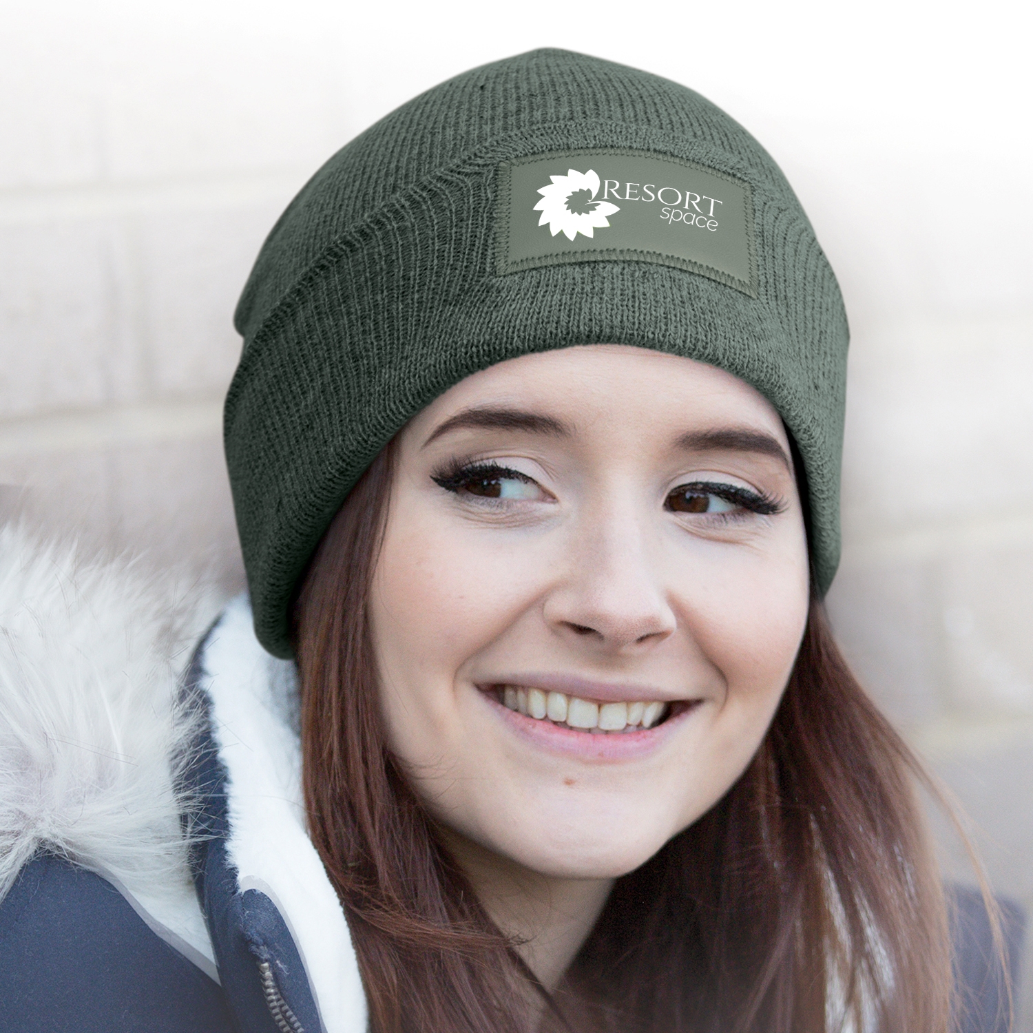 Warm knitted acrylic beanie with a roll up cuff. It has a matching leather look patch that provides a very affordable branding option. It is available in one size which will fit most people.