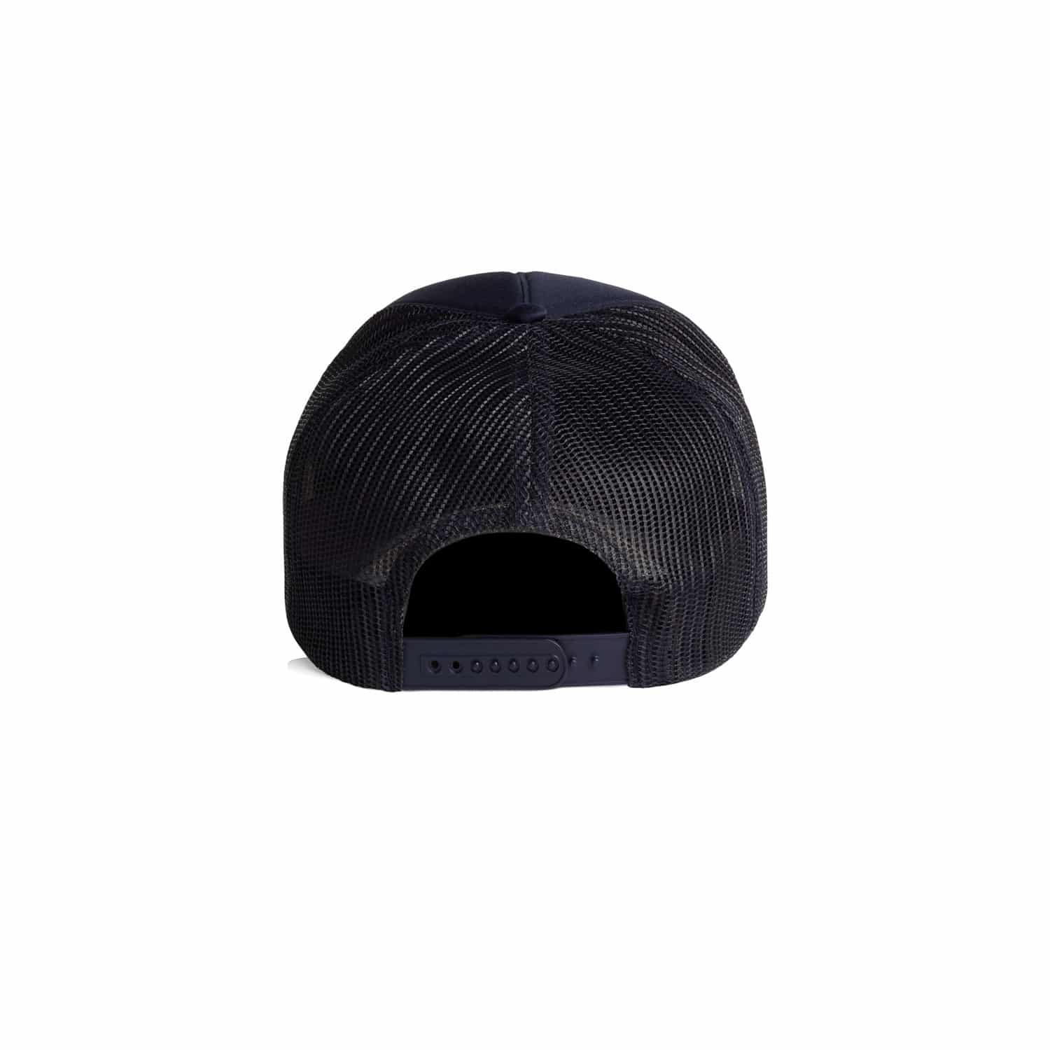 Showcasing the Frame Foam Trucker: A high-profile snapback cap with a curved peak, featuring a mid-weight construction with a 100% polyester foam front and peak, and a breathable 100% recycled polyester mesh back. Includes a plastic snapback closure, tonal under-peak lining, and tear-out label for added comfort and customization.