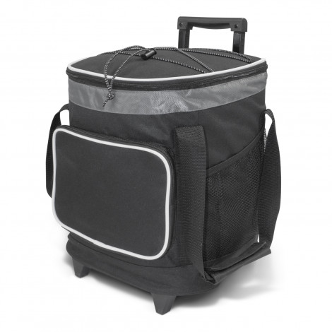 Large 16L trolley cooler bag with a two-stage pull up handle and robust dual wheels. It has thick PE foam insulation encased in a waterproof PEVA inner liner and the outer construction is 600D polyester with decorative ripstop nylon trim. Other features include a zippered top closure, two large side pockets, a large zippered front pocket, woven carry handles with a Velcro cuff and trendy elastic lacing which is ideal for holding a sweater or light jacket.