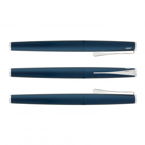 Elegant rolling ball pen which offers the choice of brushed stainless steel or heavy brass with matt finishes. This stunning pen features a unique propeller inspired clip with matching shiny chrome accents. It has a black LAMY M63 rolling ball refill with 750 metres of smooth writing ink. Studio is 100% made in Germany with the LAMY brand tastefully inscribed on the upper barrel and it is beautifully presented in a LAMY gift box. The stainless steel barrel laser engraves to a natural etch and the heavy brass barrel laser engraves to a mirror finish.