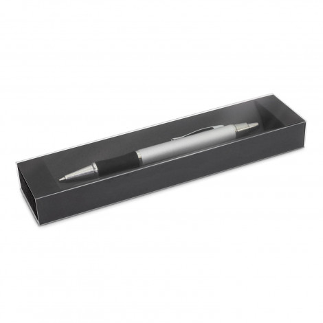 Retractable aluminium ball pen with a lacquered barrel, a soft rubber grip and shiny chrome accents. It has a black large volume refill with 1200 metres of writing ink and it laser engraves to an oxidised white colour. Moritz can be presented in an optional velvet sleeve or a gift box.