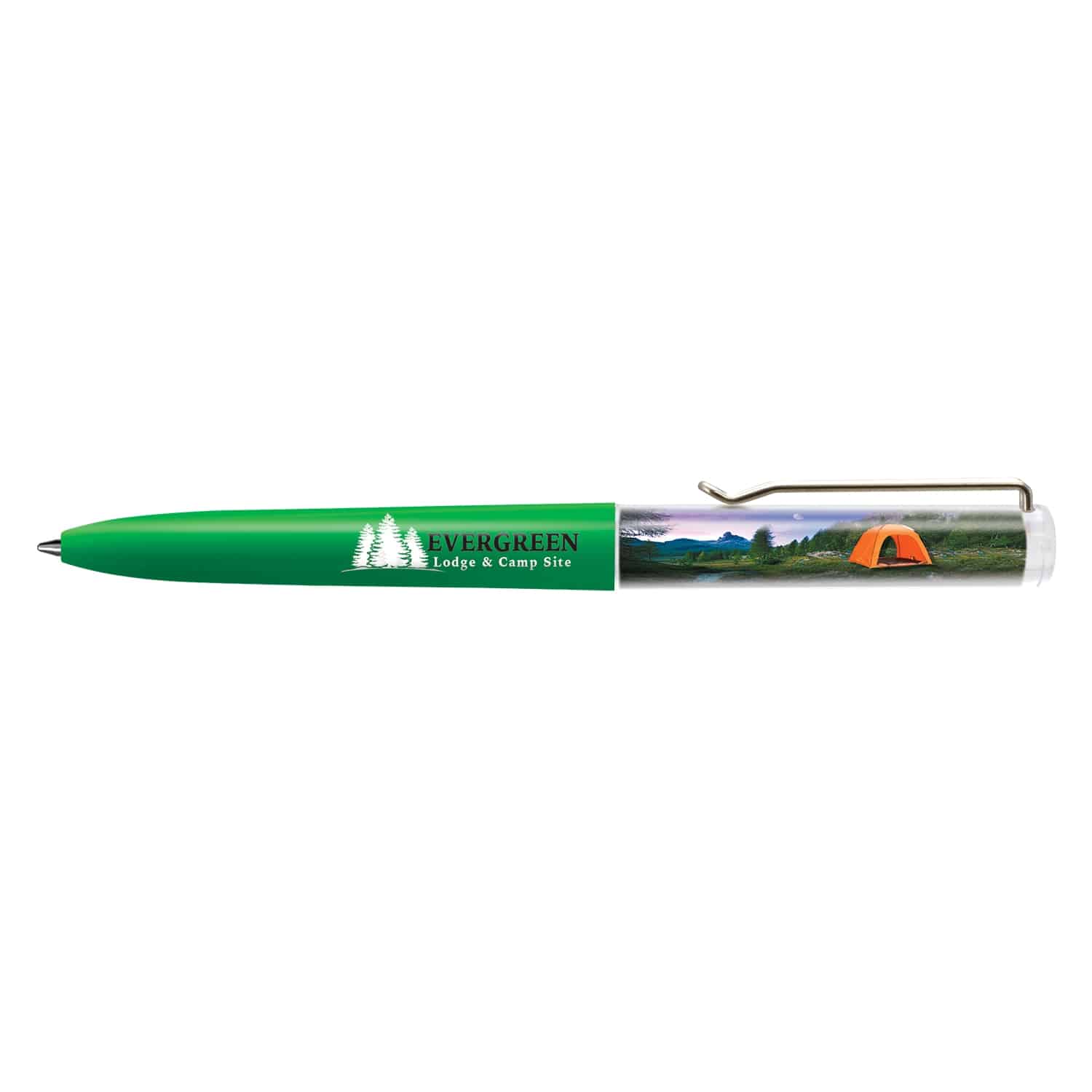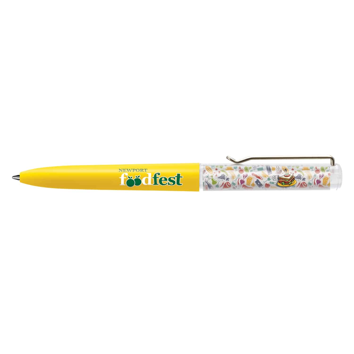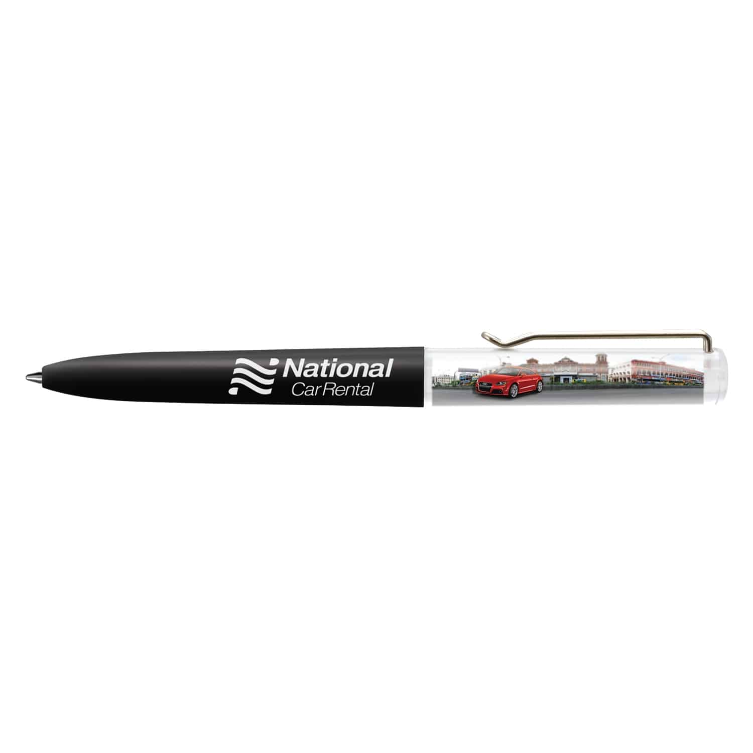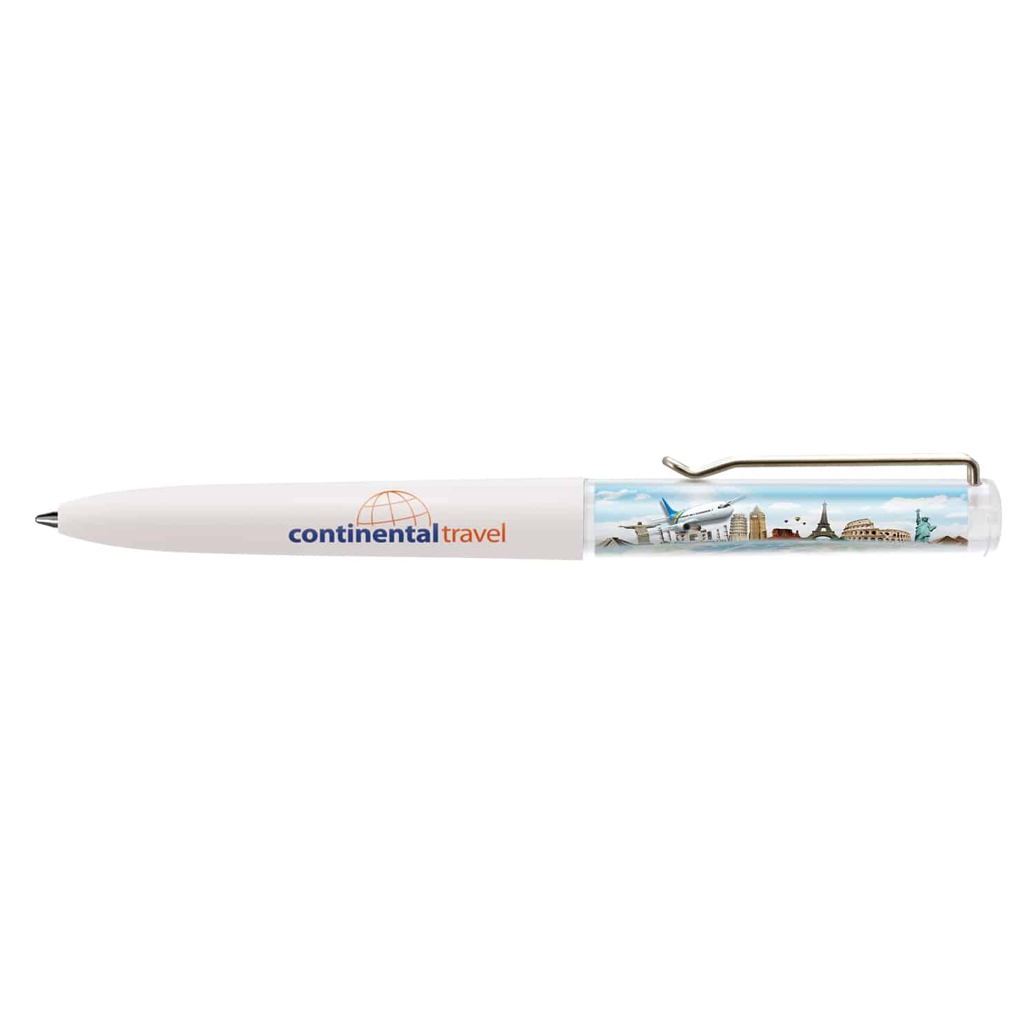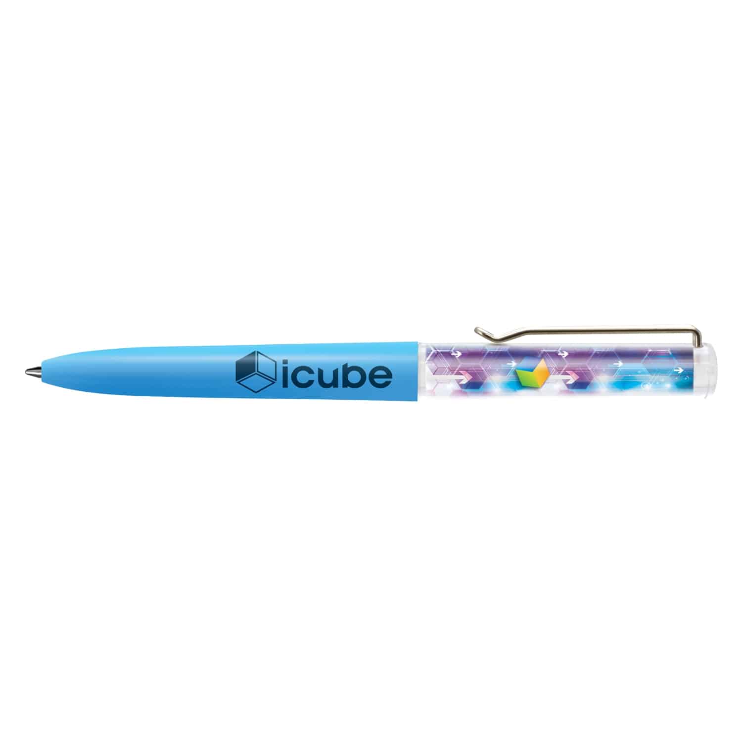 Plastic liquid filled floating action ball pen with a twist mechanism and the choice of a blue or black refill. It features an insert panel which is printed in full colour on both sides along with a floater that is customised in a two dimensional shape and moves vertically when the pen is inverted. The barrel can be manufactured in any PMS colour for an additional charge. A lead time of 30 working days applies to this product by air freight and orders can be sea freighted on request to reduce the freight cost.