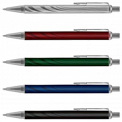 Retractable aluminium ball pen with a unique double anodised pattern in the barrel and shiny chrome accents. It has a black large volume refill with 1200 metres of writing ink and blue is available for an additional charge. Ozone laser engraves to an oxidised white colour and can be presented in an optional velvet sleeve or a gift box.