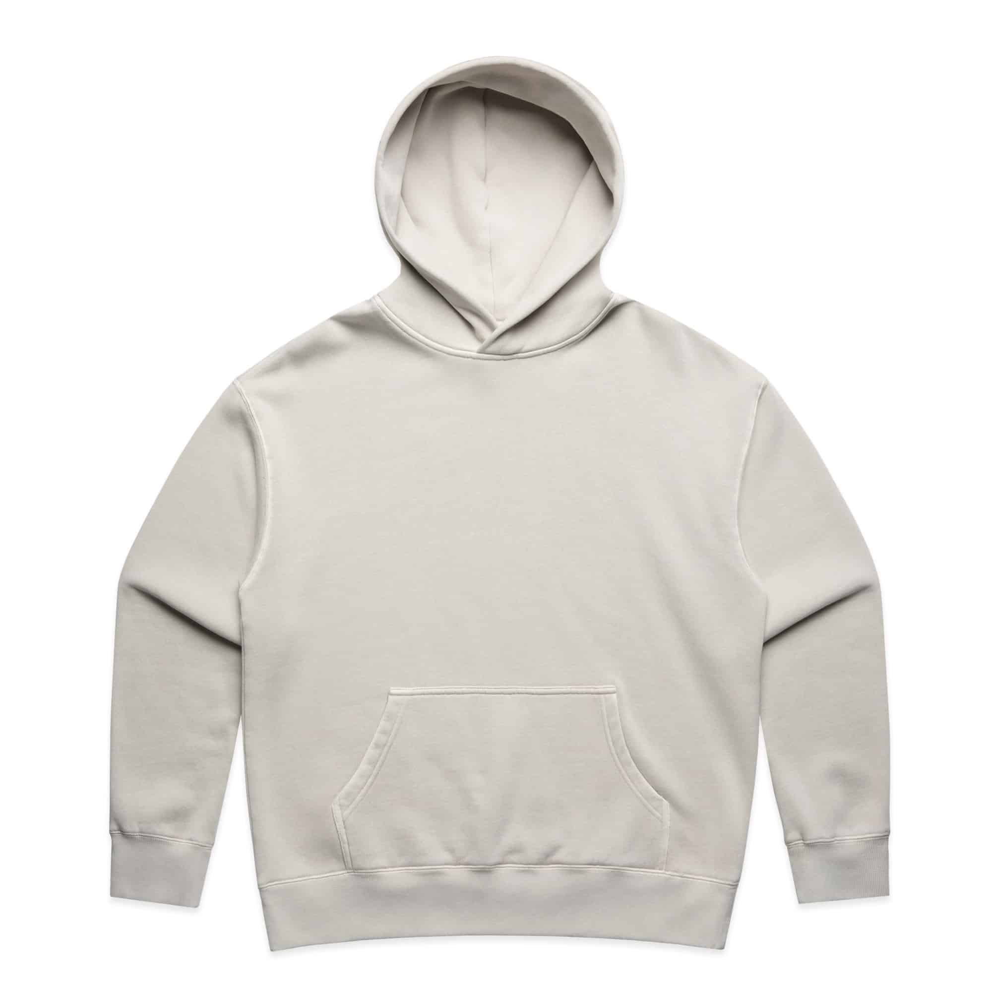 Pullover hood, drop shoulder, kangaroo pocket, self-fabric lined hood, no drawcord, garment dyed, sleeve cuff ribbing
