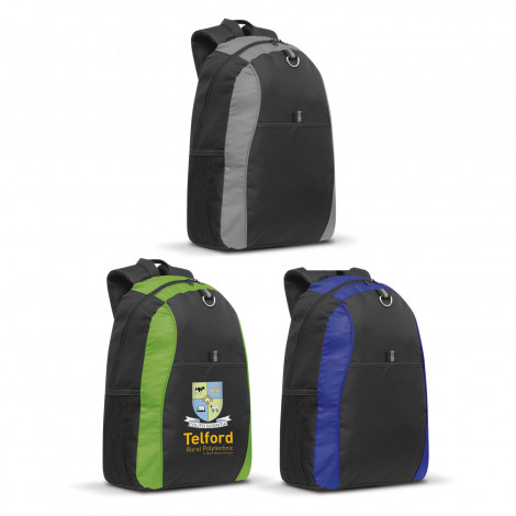 Stylish two-tone backpack which is manufactured from 600D polyester with smart patterned ripstop nylon accents. It has padded woven shoulder straps which are adjustable, a woven carry handle, a handy slip pocket on the front and two mesh side pockets.