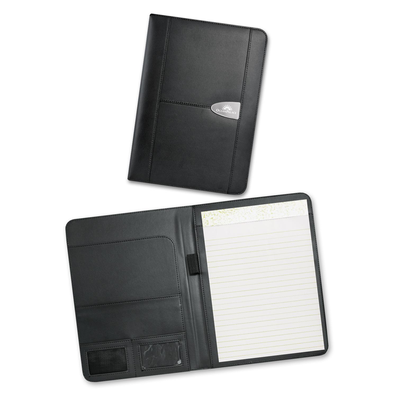 Superior large portfolio with a superb bonded leather cover. It has a lined pad, a business card pocket and a pen loop. Sovrano has a unique metal centre plate which can be branded with the choice of a resin coated finish or a metal insert that laser engraves to a stainless steel finish. It can also be laser engraved directly onto the portfolio and can include individual names for an additional charge. The portfolio surface laser engraves to a matt brown finish.
