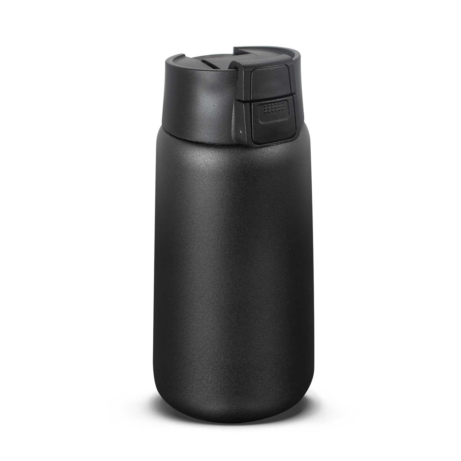 Impressive 500ml double wall, vacuum insulated stainless steel mug with a smart powder coated matt finish that will keep drinks warm for hours. Stealth has a wide top opening with a secure screw on lid and a push button activated flip closure which is spring-loaded for smooth, effortless operation. It is ideal for coffee as well as taking soup and food to work or school. The mug is BPA-free, laser engraves to a stainless steel finish and is presented in a black gift box. This product is not dishwasher safe and handwashing is recommended.