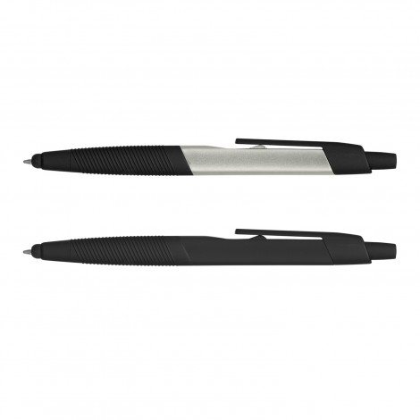 Retractable plastic ball pen with a metallic barrel, a soft-touch rubber lacquered grip and clip and a stylus for use with touch screens. It has a black refill with 1200 metres of German manufactured Dokumental ink and a tungsten carbide ball for improved writing quality.