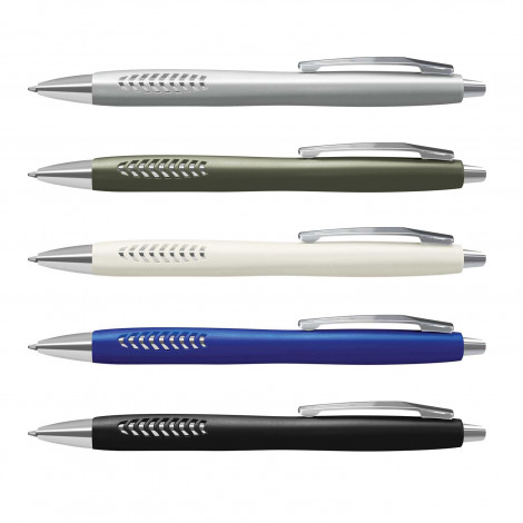 Retractable plastic ball pen with a metallic barrel and shiny chrome trim. Topaz has a comfortable triangular grip with a futuristic chevron pattern that allows the shiny chrome inner barrel to show. It has a blue refill with 1800 metres of German manufactured Dokumental ink and a tungsten carbide ball for improved writing quality.